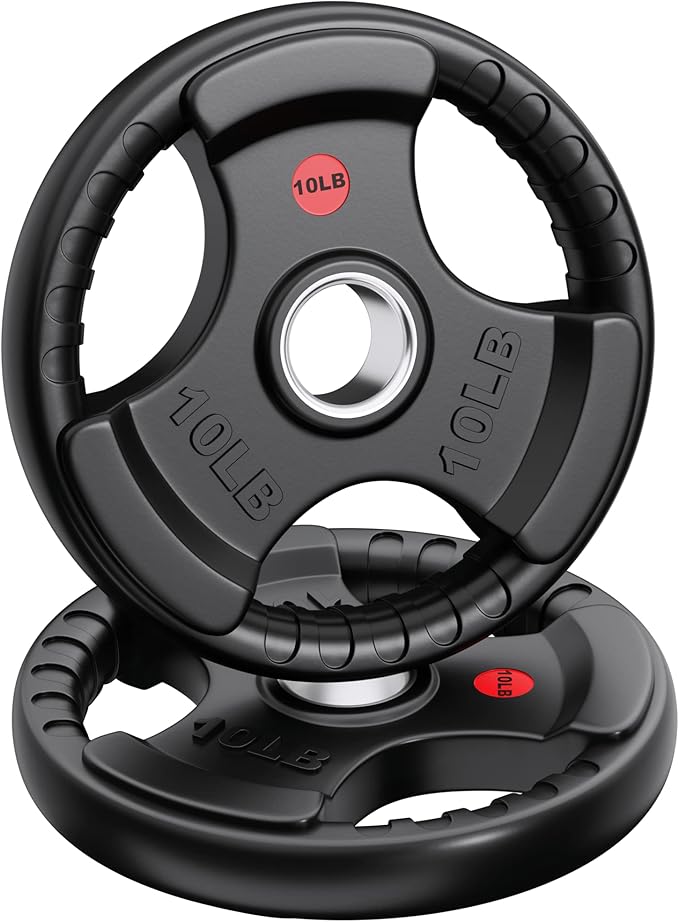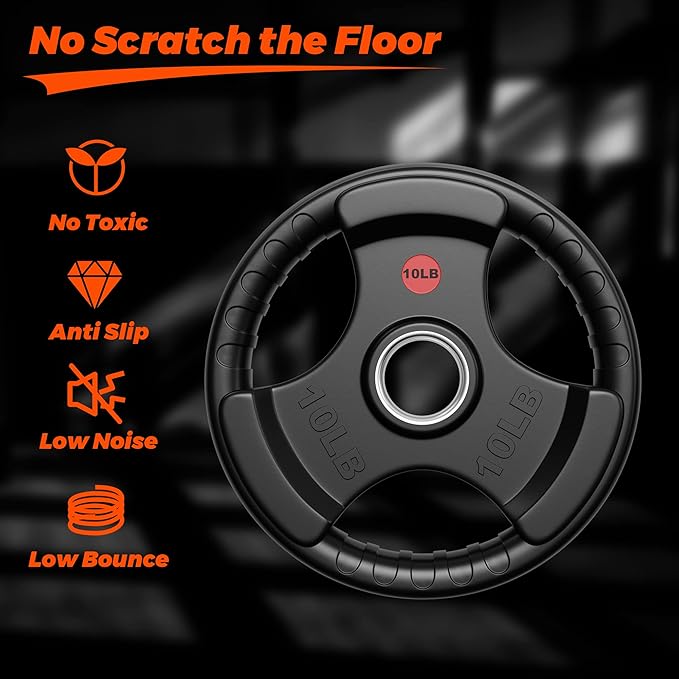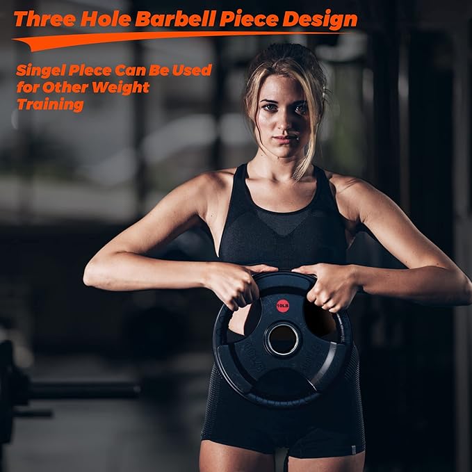 - EASY GRIP – The Olympic weight plates is designed with three holes and there are grooves in the grip holes for easy and safe handling when loading and unloading heavy objects. Descending and lowering after weight training is safer and more practical. The comfortable grip also gives you a good using experience.