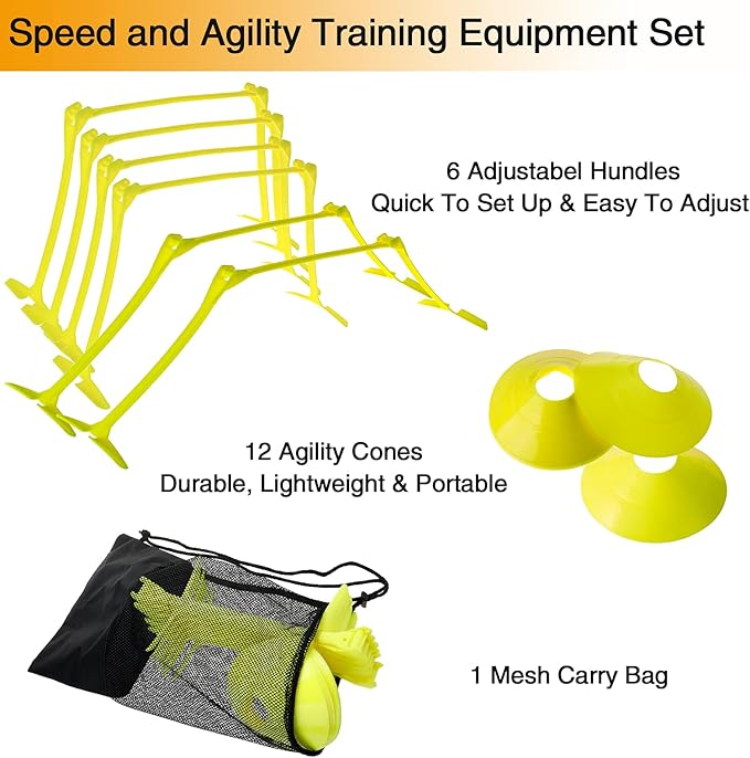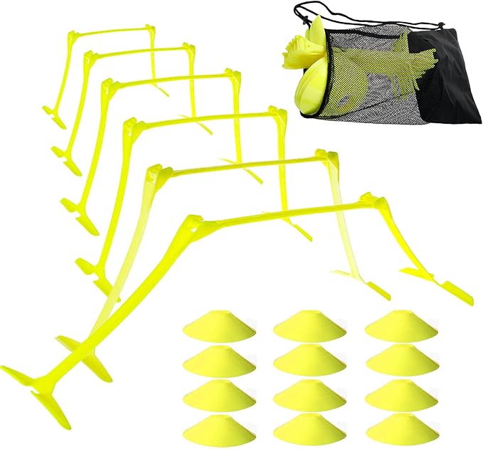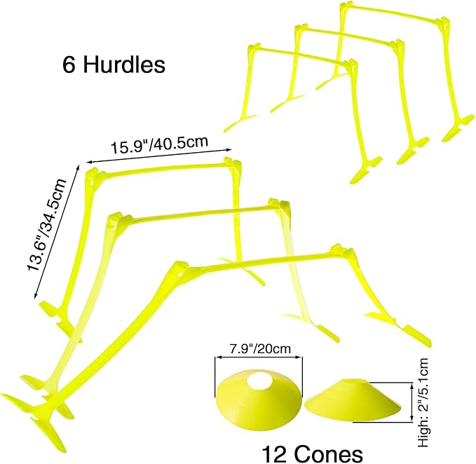 - 【Agility Hurdle Set】- Our speed and agility training equipment set that includes 6 adjustable hurdles, 12 speed cones, and 1 mesh carrying bag. The perfect set for any kind of drills and skills sharpening.