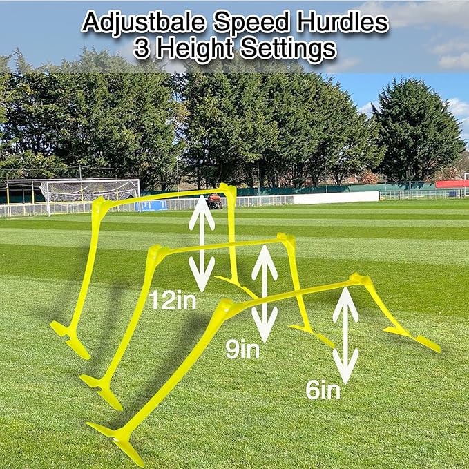 - 【Adjustable In Height】- Setting up and adjusting this hurdles is very easy, you just need rotate the legs until you hear a click at the 6", 9", or 12" height settings. Just adjust the height of the hurdle instead of having to carry around bulky and heavy equipment.