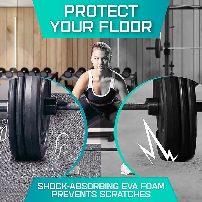 - DURABLE & NON SLIP: Non-skid textured and shock- absorbing surface provides a soft feeling when exercise on, best for comfortable workout area – a combination of high density EVA foam mat & exercise mat for excellent support and cushion. EASY TO CLEAN: The water-resistant & noise-reducing design is easy to clean. The moisture-resistant technology & high-quality material make the mat easy to wash with soap & water