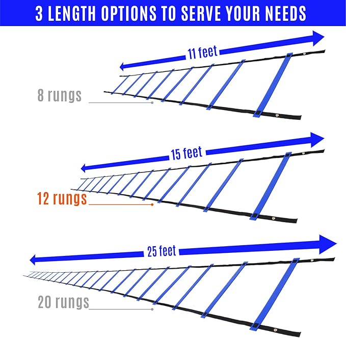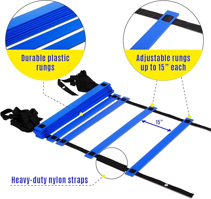- BOOST FOOTWORK FOR VARIOUS TRAINING LEVEL: Exercise ladder is designed with 8, 12, and 20 rungs; Rung-to-rung distance can be adjusted up to 15 inches, making soccer equipment suitable for different skill sets levels; Instruction is included