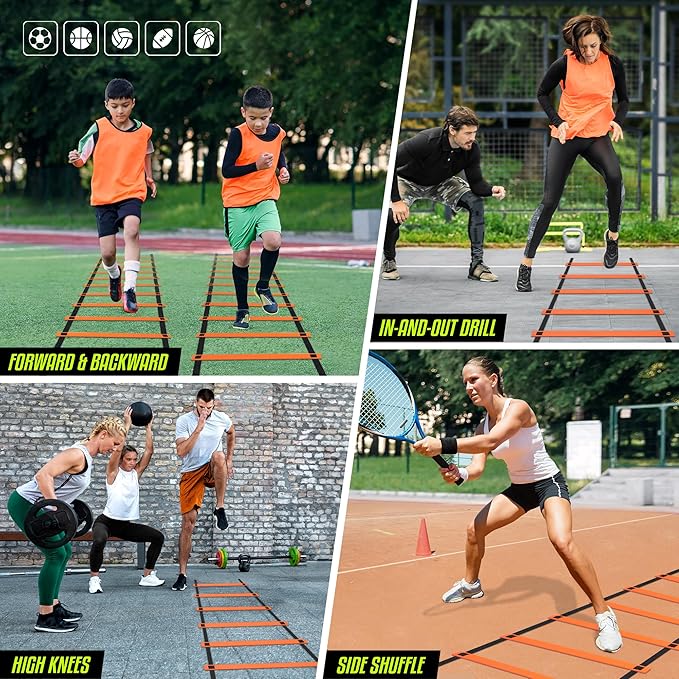 - BOOST FOOTWORK FOR VARIOUS TRAINING LEVEL: Exercise ladder is designed with 8, 12, and 20 rungs; Rung-to-rung distance can be adjusted up to 15 inches, making soccer equipment suitable for different skill sets levels; Instruction is included