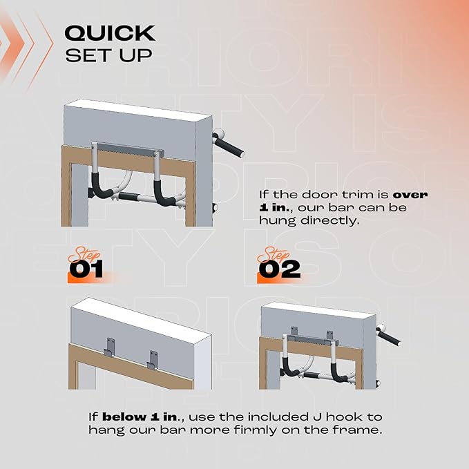 • EASY AND QUICK INSTALLATION: Our door frame pull up bar comes with an easy to follow manual and all necessary tools; No screws are required for door trim above 13/16 inch, while a J hook mount is necessary for door trim less than 13/16 inch