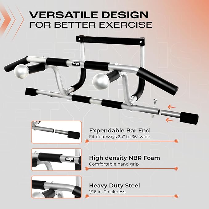• HEAVY DUTY STEEL MAIN BAR: The thick steel pull up bar door frame can hold up to 300 pounds; Its sturdy construction provides stability and support during your workouts