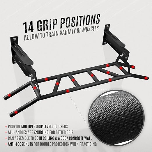 - INCLUDING VARIOUS HANDLE POSITIONS (14 grip positions): Diversify your training method by switching among different handle positions, since it will affect various muscle groups than normal chin up bar; Besides, the diameter of the handle is 1.5 inches making it more appropriate for long lasting exercising