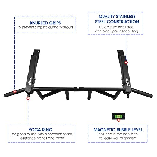 • MAGNETIC BUBBLE LEVEL: Our joist pull up bar is easy to install on any ceiling joist. It's also suitable as a wall mounted pull up bar , making it a versatile choice for home gyms. Comes with all the necessary hardware for a hassle-free setup.