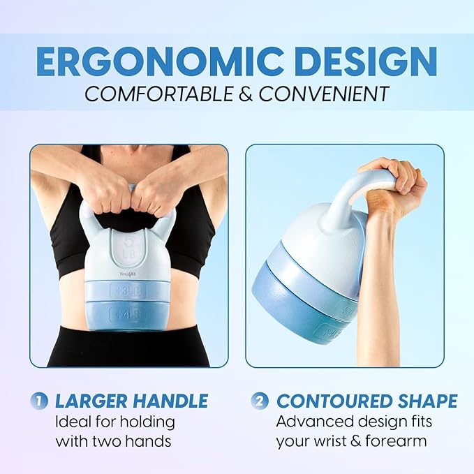 - WIDE COMFORTABLE HANDLE: The kettlebell has wide handle, providing flexibility and better grip for exercises requiring both arms; The contoured shape of adjustable kettlebell set is a comfortable fit during workout