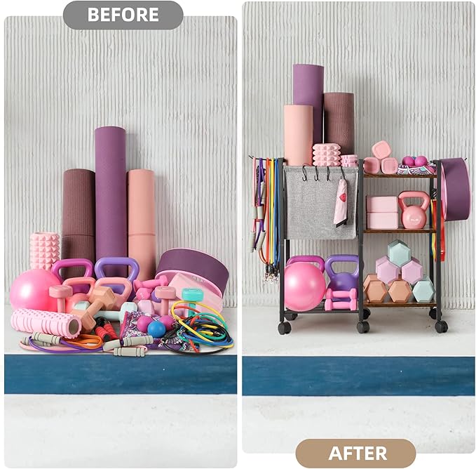 - 【EXTRA LARGE CAPACITY HOME GYM STORAGE RACK】 Our exercise equipment storage rack consists of 4-tier of storage racks and a storage basket, which can store your various fitness equipment, such as workout mat, yoga mat thick, yoga block, foam roller, dumbbells, kettlebells, resistance bands and so on, perfect for fan of yoga and fitness enthusiast.