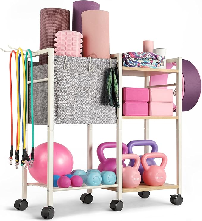 - 【EXTRA LARGE CAPACITY HOME GYM STORAGE RACK】 Our exercise equipment storage rack consists of 4-tier of storage racks and a storage basket, which can store your various fitness equipment, such as workout mat, yoga mat thick, yoga block, foam roller, dumbbells, kettlebells, resistance bands and so on, perfect for fan of yoga and fitness enthusiast.