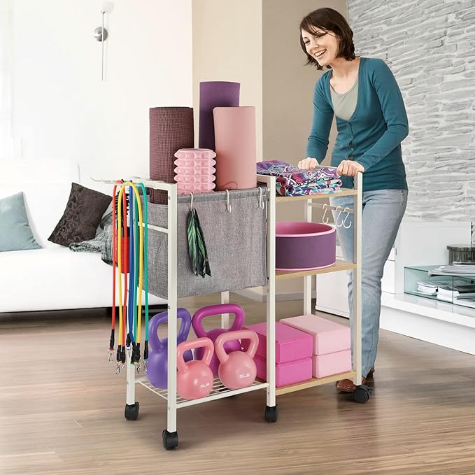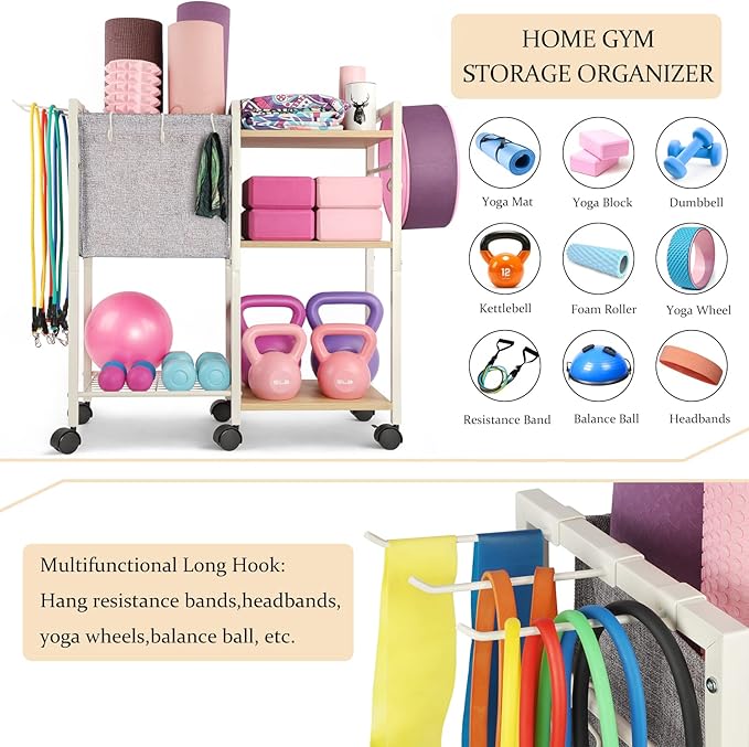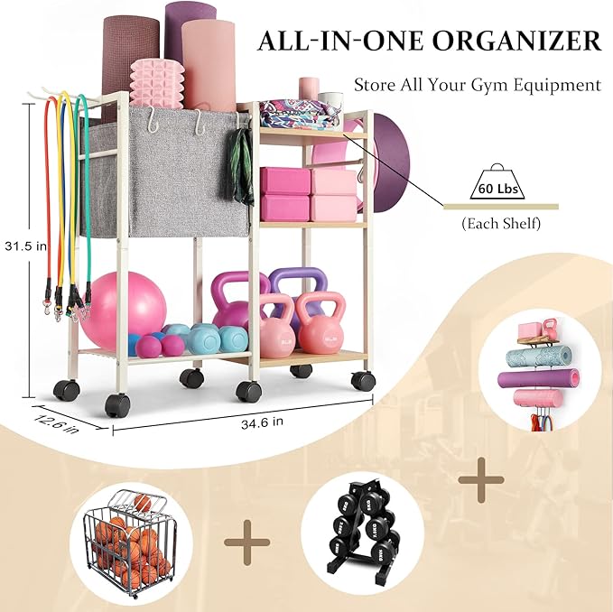 - 【EXTRA LARGE CAPACITY HOME GYM STORAGE RACK】 Our exercise equipment storage rack consists of 4-tier of storage racks and a storage basket, which can store your various fitness equipment, such as workout mat, yoga mat thick, yoga block, foam roller, dumbbells, kettlebells, resistance bands and so on, perfect for fan of yoga and fitness enthusiast.