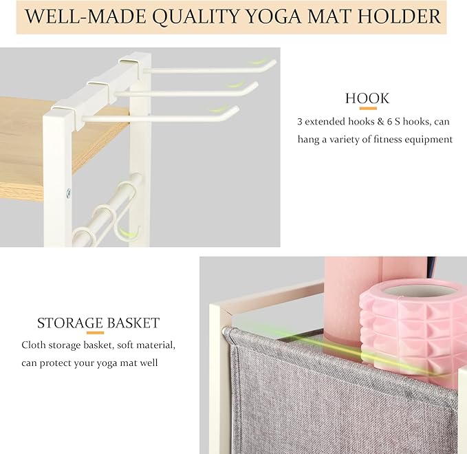 - 【HIGH QUALITY YOGA MAT STORAGE RACK】 This yoga mat holder is made of high-quality coated finish steel and wood storage rack, combined with a cloth storage basket, the whole construction is sturdy and durable, it will match well with any of your furniture. The yoga mat storage suitable for various scenarios, such as gym, home gym, living room, bedroom, garage and so on.