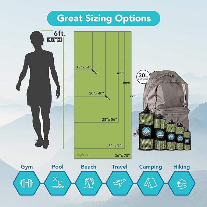• PACK FOR ANY SITUATION: Youphoria all-purpose travel towels come in three convenient sizes, in inches: 20 x 40, 28 x 56, and 32 x 72. Whether you need pack light camping towel, shower gym towel, a small pack towel, or a large beach towel, we've got your covered. Youphoria microfiber towels are a more convenient and packable option for your on-the-go needs.